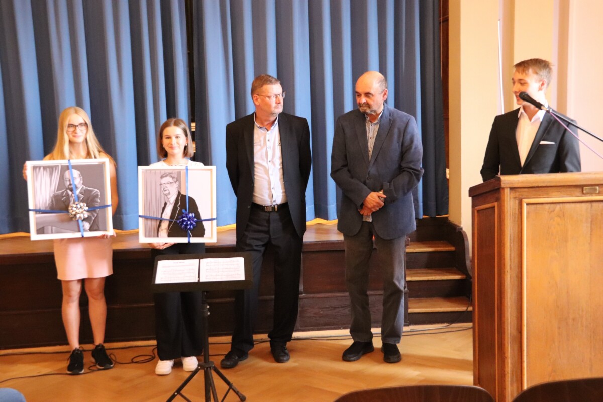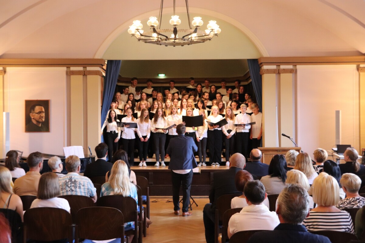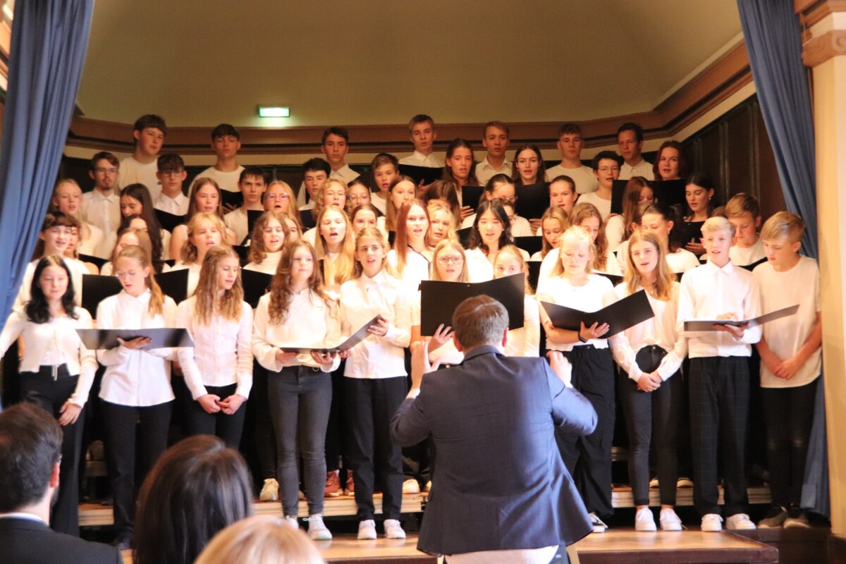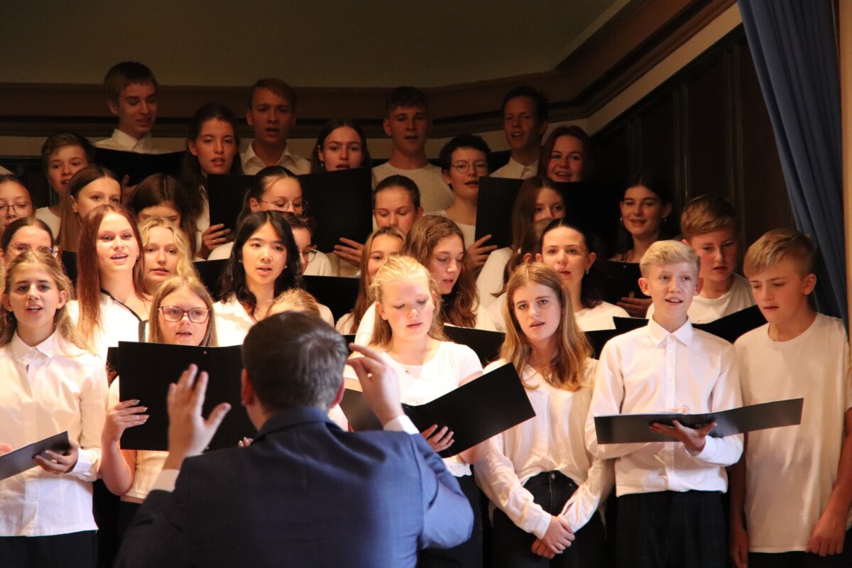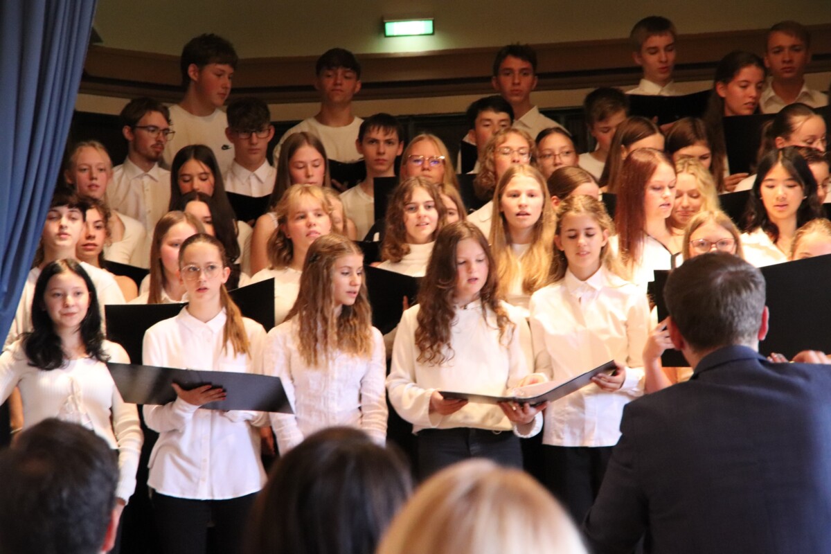 Im Festsaal des Gymnasiums führte der ehemalige Schüler Frederik Haarig durch das Programm. Gemeinsam mit Christian Herrmann am Flügel bot er verschiedene Beiträge des Salonensembles „Vinoresque“ dar. Zur musikalischen Umrahmung zählten außerdem ein von Nicolette Lein am Flügel und Elias Lein an der Geige gespieltes Stück aus Vivaldis „Concerto con Violino Solo obligato“ und Lieder des Chors unserer Schule unter der Leitung von Jonas Emhardt und Tobias Möckel.