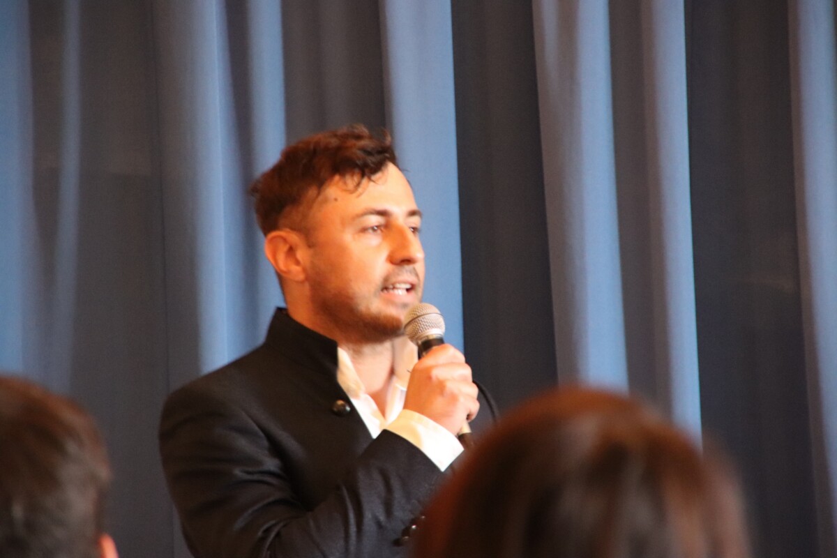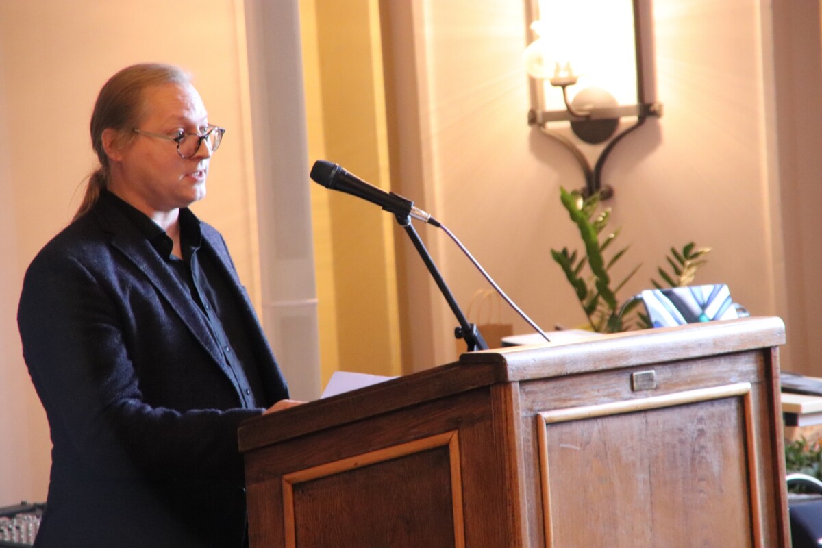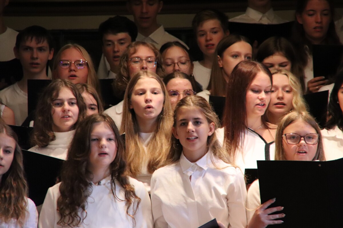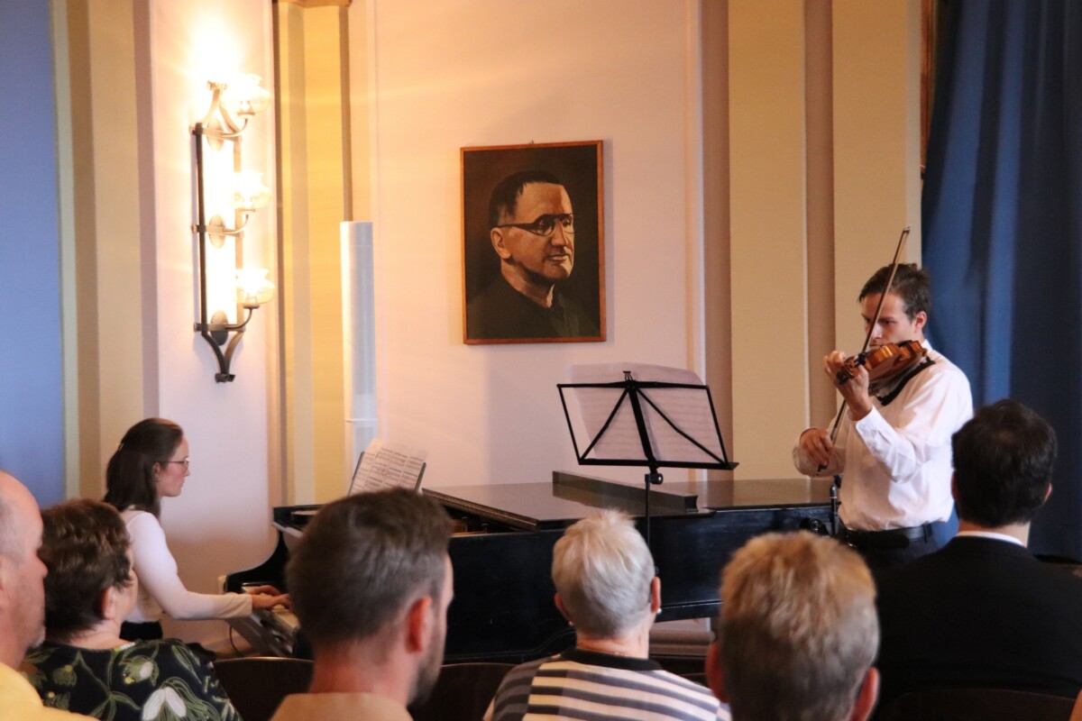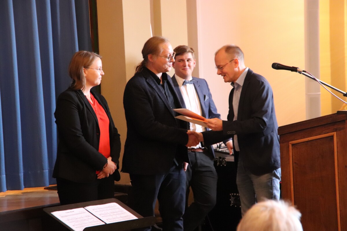 Im Festsaal des Gymnasiums führte der ehemalige Schüler Frederik Haarig durch das Programm. Gemeinsam mit Christian Herrmann am Flügel bot er verschiedene Beiträge des Salonensembles „Vinoresque“ dar. Zur musikalischen Umrahmung zählten außerdem ein von Nicolette Lein am Flügel und Elias Lein an der Geige gespieltes Stück aus Vivaldis „Concerto con Violino Solo obligato“ und Lieder des Chors unserer Schule unter der Leitung von Jonas Emhardt und Tobias Möckel.