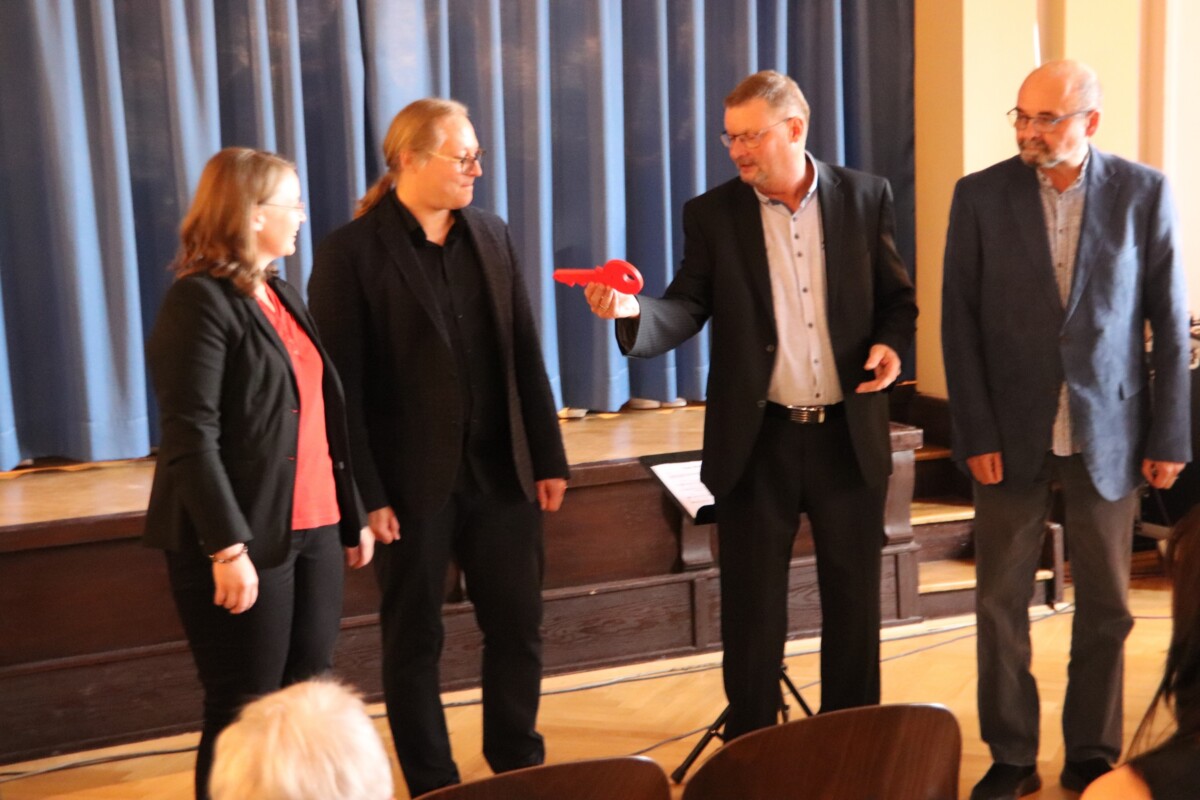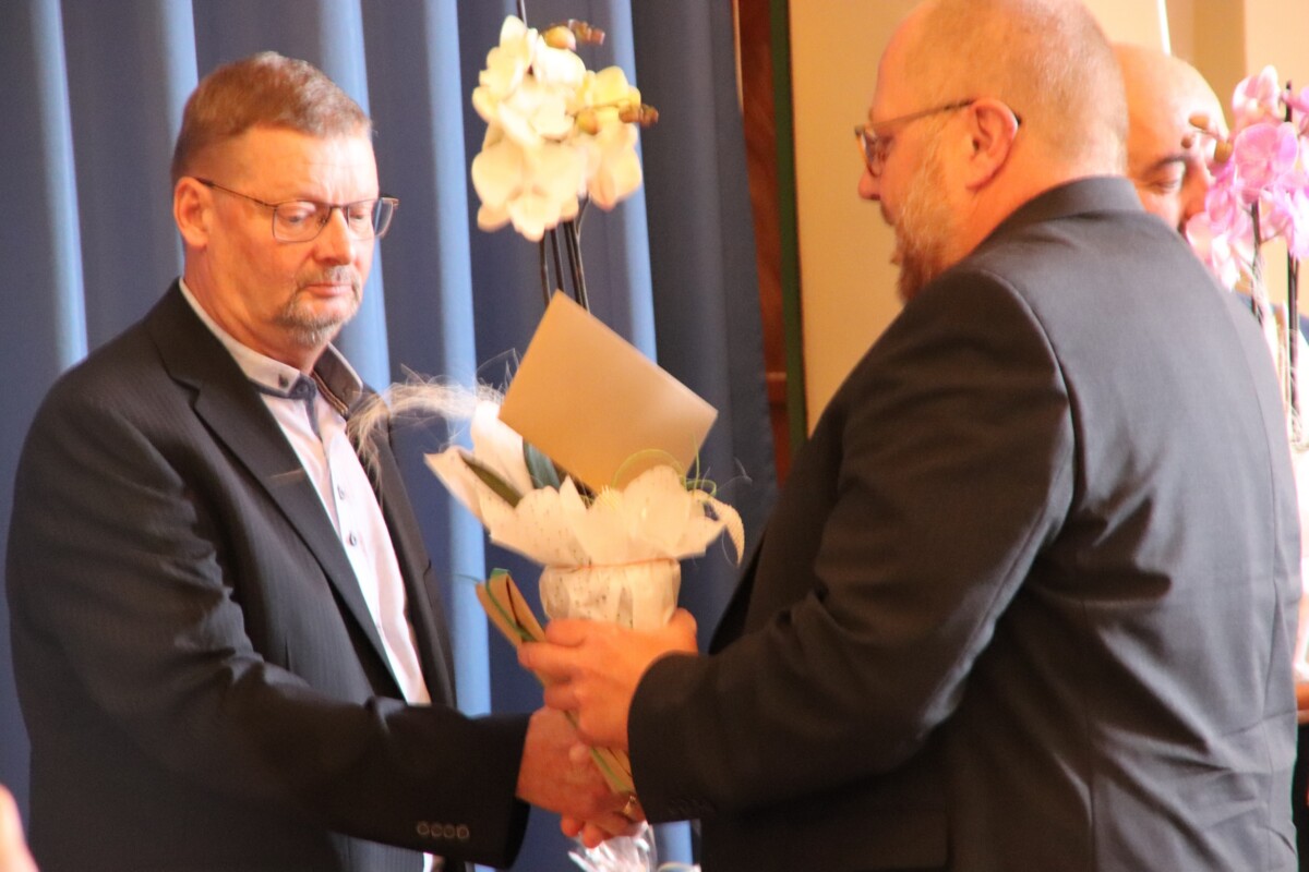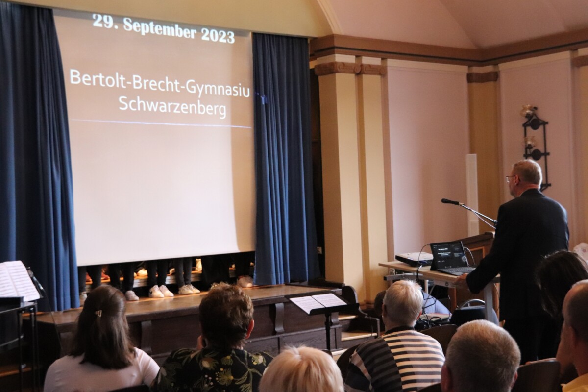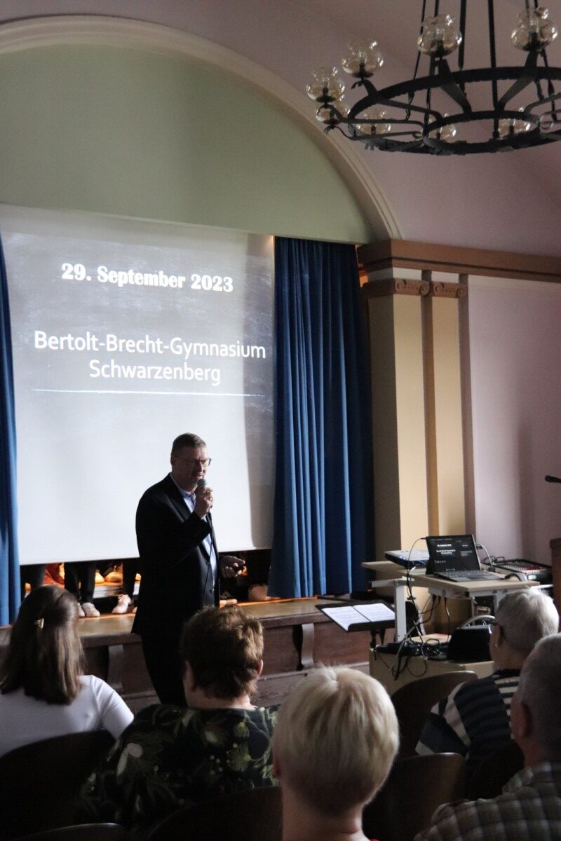 Die Hauptamtsleiterin der Großen Kreisstadt Schwarzenberg Sylvia Mack würdigte in ihren Grußworten die langjährige fruchtvolle Zusammenarbeit zwischen der Bildungseinrichtung und den städtischen Verantwortungsträgern, Altlandrat Karl Matko ließ in einer Grußadresse seine große Anerkennung für die Arbeit der beiden Pädagogen zum Ausdruck bringen, Vertreter des Kollegiums bedankten sich für das respektvolle und professionelle Miteinander und der für die Gymnasien beim Landesamt für Schule und Bildung Chemnitz zuständige Referent Ralf Matthes hob den reibungslosen Übergang in der Führungsetage der Schule hervor.