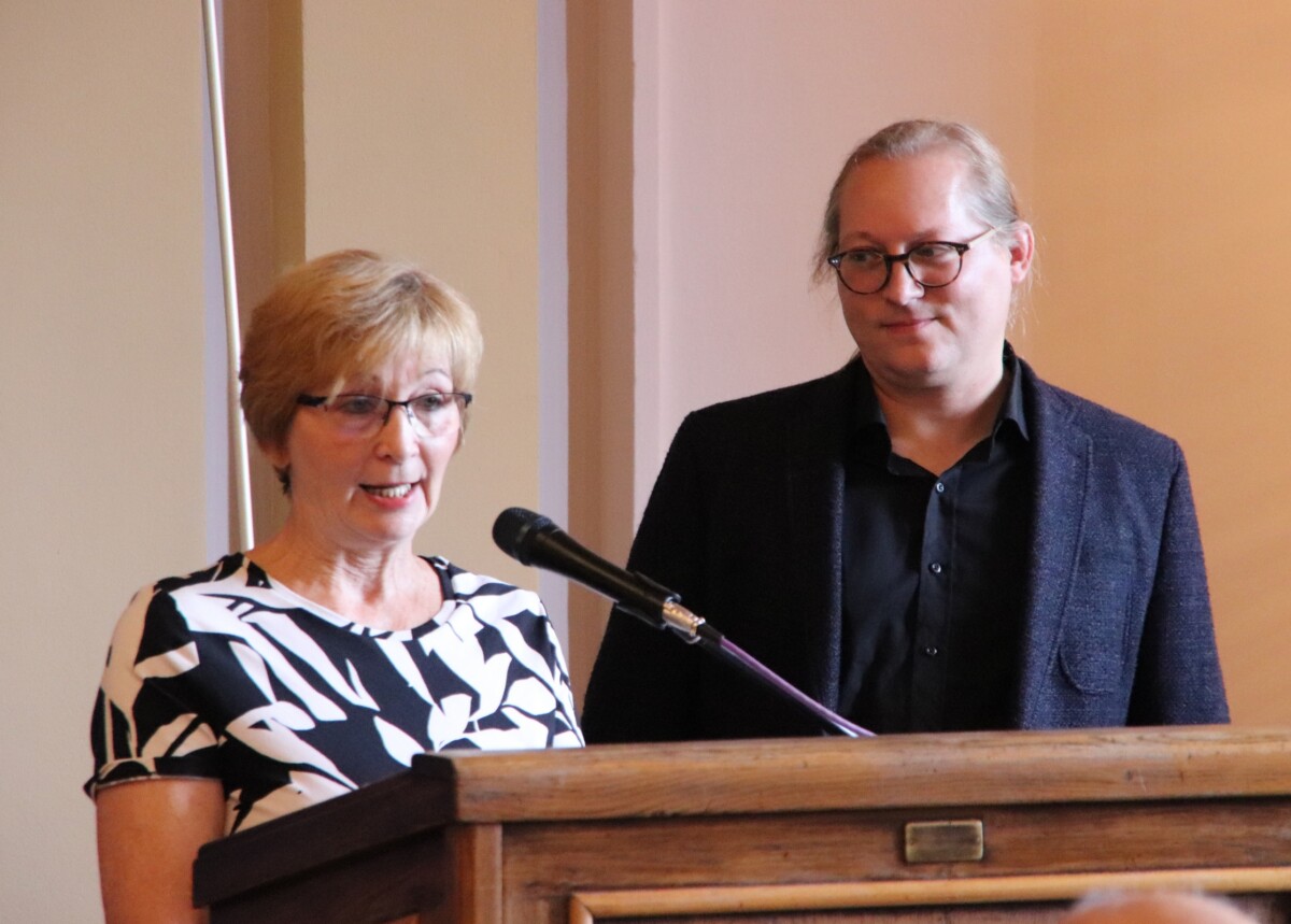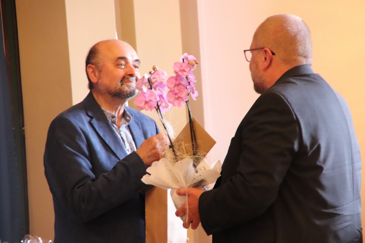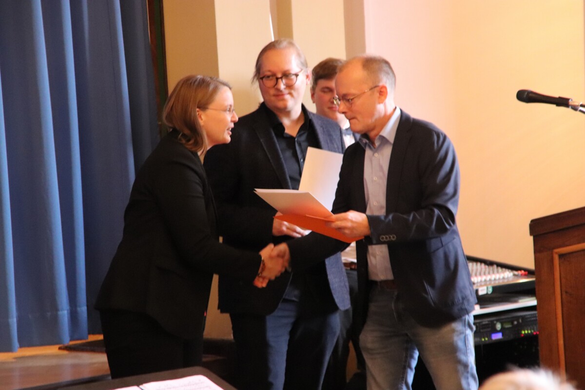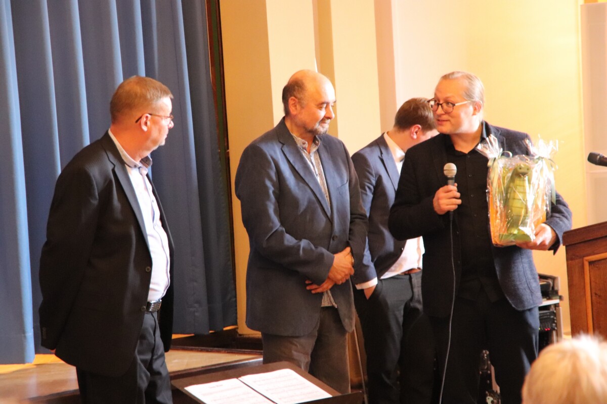 Die Hauptamtsleiterin der Großen Kreisstadt Schwarzenberg Sylvia Mack würdigte in ihren Grußworten die langjährige fruchtvolle Zusammenarbeit zwischen der Bildungseinrichtung und den städtischen Verantwortungsträgern, Altlandrat Karl Matko ließ in einer Grußadresse seine große Anerkennung für die Arbeit der beiden Pädagogen zum Ausdruck bringen, Vertreter des Kollegiums bedankten sich für das respektvolle und professionelle Miteinander und der für die Gymnasien beim Landesamt für Schule und Bildung Chemnitz zuständige Referent Ralf Matthes hob den reibungslosen Übergang in der Führungsetage der Schule hervor.