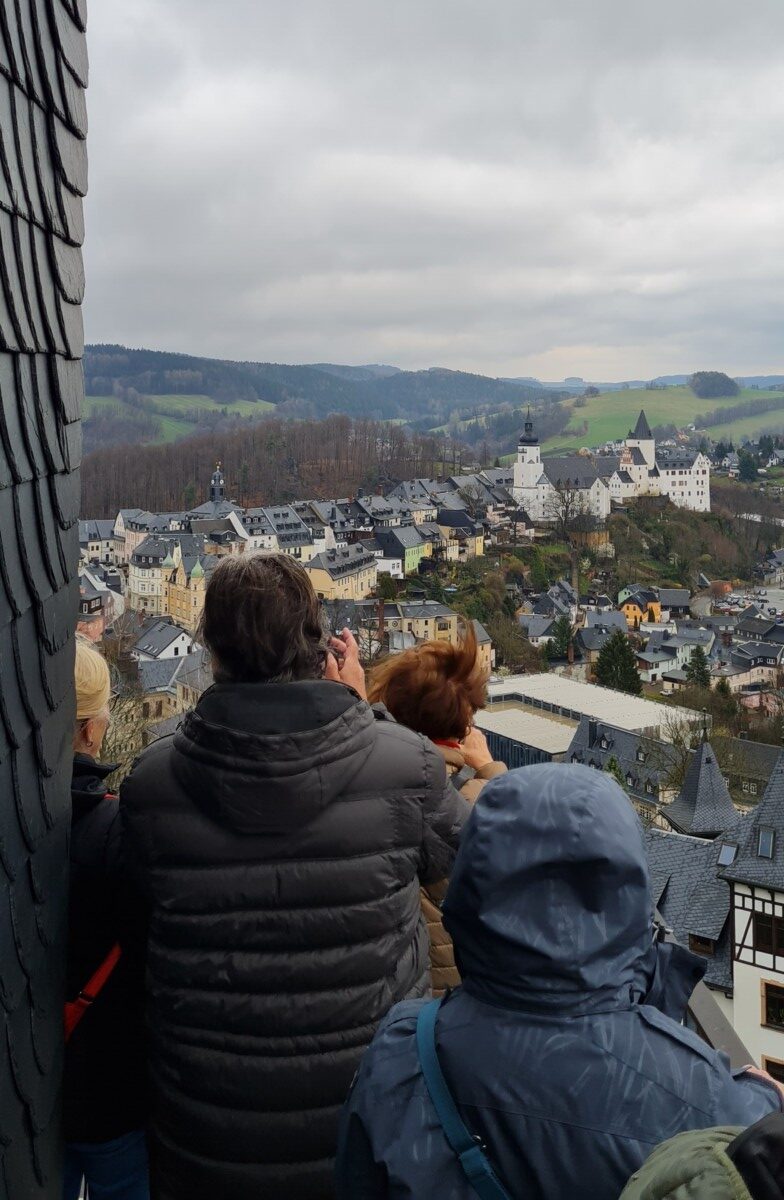 Betritt man das Haus 1 unserer Schule, fühlt man sich leicht in die Zeit der Erbauung vor mehr als 100 Jahren zurückversetzt. Vom Lernen in historischem Gemäuer verschafften sich am heutigen Samstagvormittag etwa 50 Freunde der Baukunst einen Eindruck, die auf einer Rundfahrt durch den Südwesten des Freistaats zum Thema „Schulen der Moderne“ in Schwarzenberg Halt machten. Die vom wissenschaftlichen Mitarbeiter beim Chemnitzer Schloßbergmuseum Peer Ehmke geleitete Reisegruppe erfuhr in einem reich bebilderten Vortrag von André Ullmann, dem langjährigen stellvertretenden Schulleiter des Bertolt-Brecht-Gymnasiums, viel Interessantes zu Geschichte und Architektur des Gebäudes. Der abschließende Aufstieg durch das Dachgebälk auf den Turm der Schule wurde mit einem grandiosen Blick über Schwarzenberg belohnt. Die Gäste würdigten die Führung durch unser Haus mit einer Spende an den Förderverein. Dafür ein herzliches „Dankeschön!“
