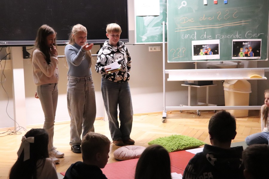 Die Hauptpersonen des Abends, unsere Gäste aus den vierten Klassen der Umgebung, erlebten inzwischen einen entspannten Leseabend, den Schülerinnen und Schüler der Klassenstufen 5 und 6 für sie vorbereitet hatten. Sie hörten Ausschnitte aus „Gregs Tagebuch“, „Die drei Fragezeichen“ oder „Rolf der kleine Waldtroll“, konnten malen oder kurzen Theatereinlagen zuschauen, sich bei einem kleinen Imbiss stärken und etwas vom Teamgeist unserer Schülerschaft spüren.