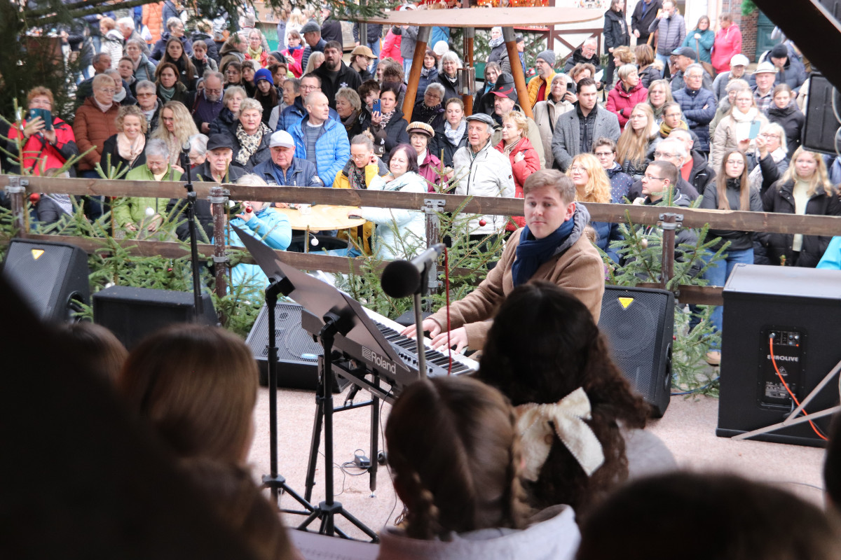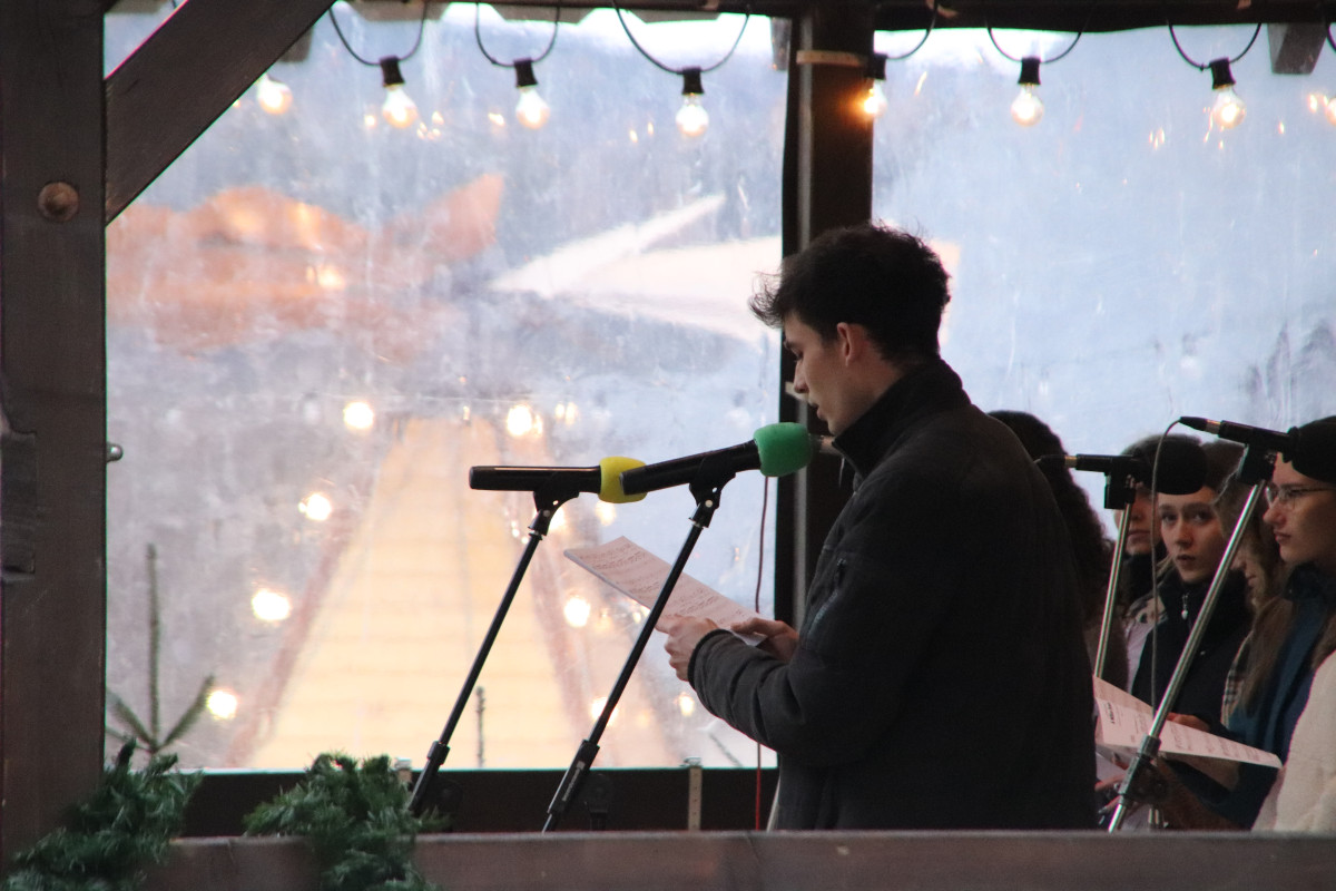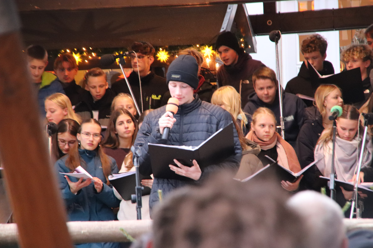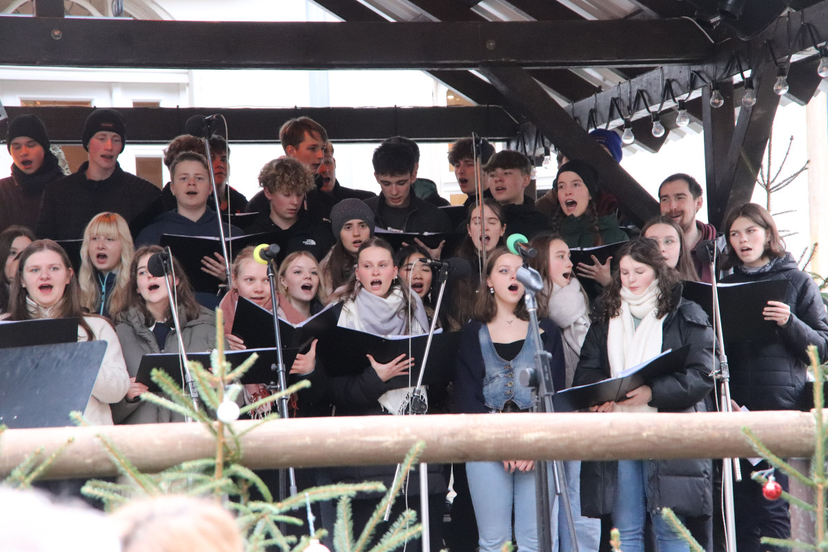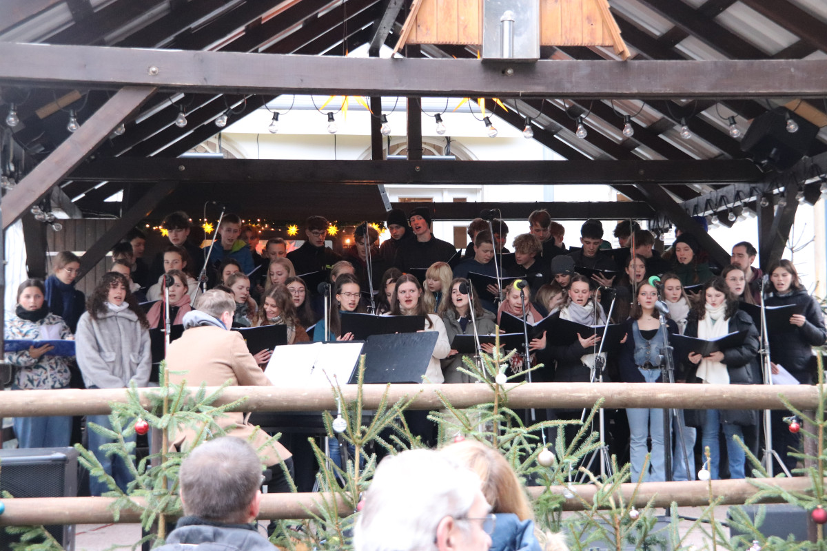 Am heutigen Montagnachmittag standen für unsere Schülerinnen und Schüler gleich zwei Veranstaltungen auf den Schwarzenberger Weihnachtsmarkt an. Zunächst gab der Chor unserer Schule ein einstündiges Konzert auf der Bühne am Markt. Begleitet von Chorleiter Jonas Emhardt und moderiert von Paul Seemann (Jahrgangsstufe 12) erklangen erzgebirgische Weisen, deutsch- und englischsprachige Weihnachtsklassiker sowie das von Hoffnung und individuellen Zielen geprägte „A Million Dreams“.