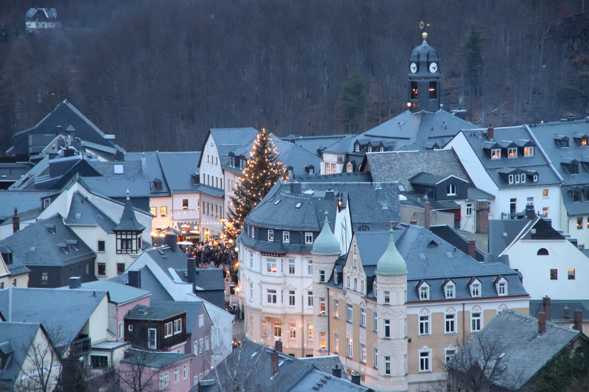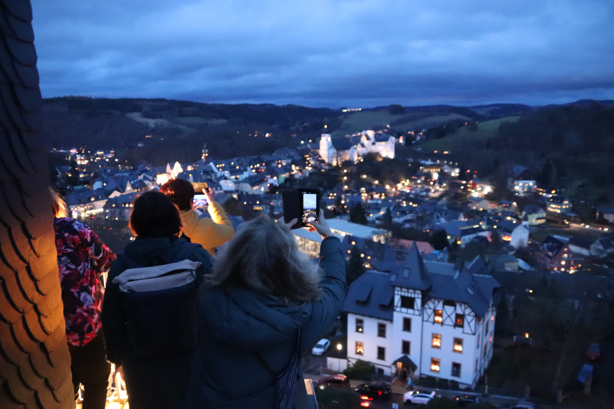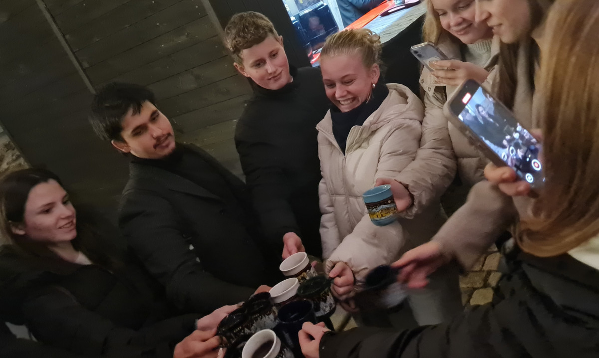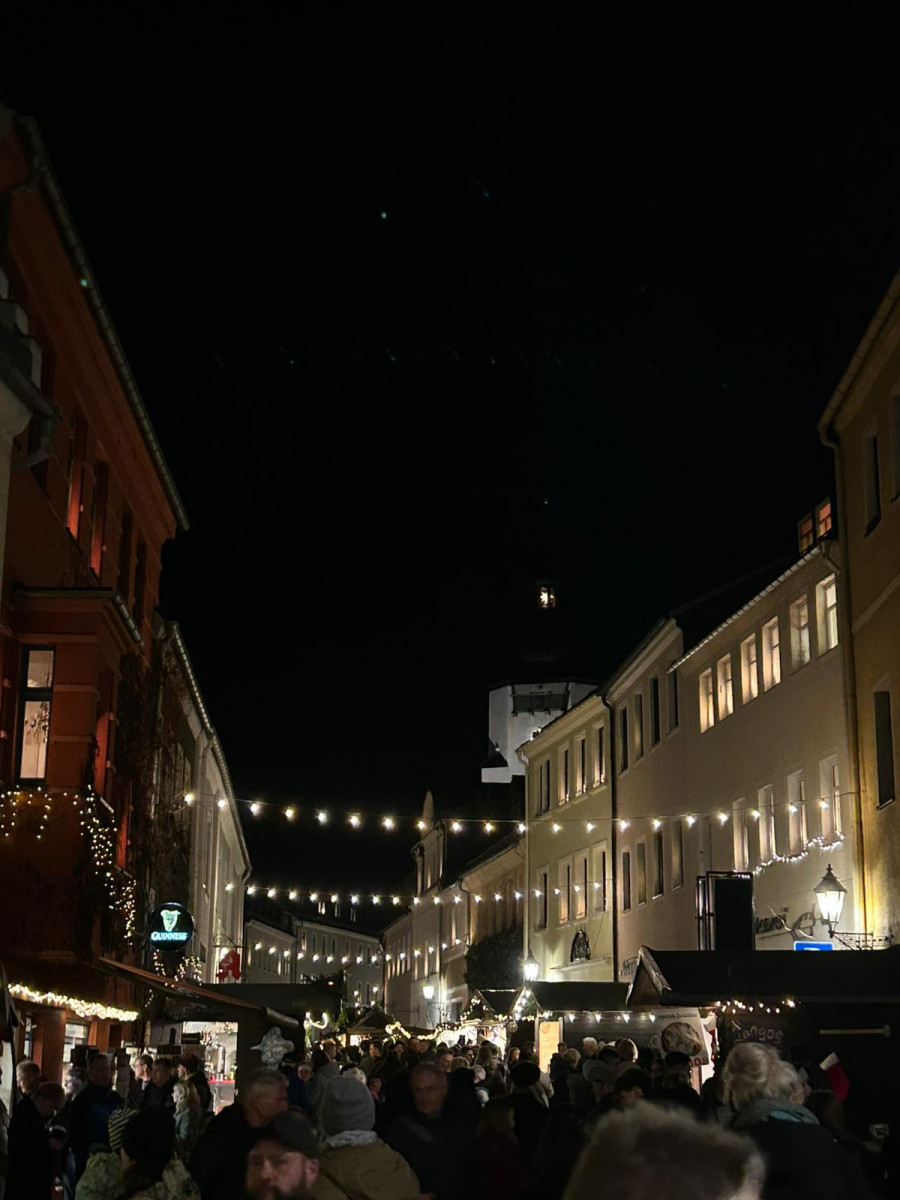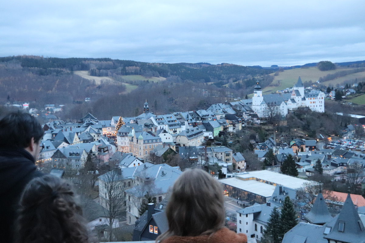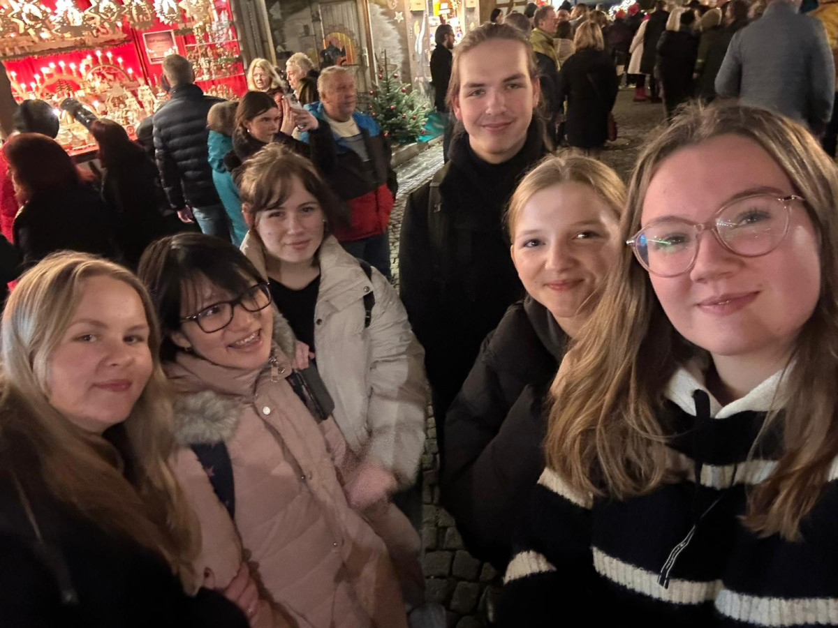 Zum zweiten Programmpunkt des Tages reisten Schülerinnen, Schüler und Lehrkräfte unseres Partnergymnasiums aus Ostrov an. Vom Aussichtspunkt auf dem Dach der Schule konnten sie beobachten, wie sich die Stadt nach und nach in ein vorweihnachtliches Lichtermeer verwandelte. Anschließend tauchten sie in deutsch-tschechischen Teams in das Markttreiben ein, genossen Kinderpunsch und viele andere Leckereien und hielten für einen Fotowettbewerb die schönsten Momente fest.