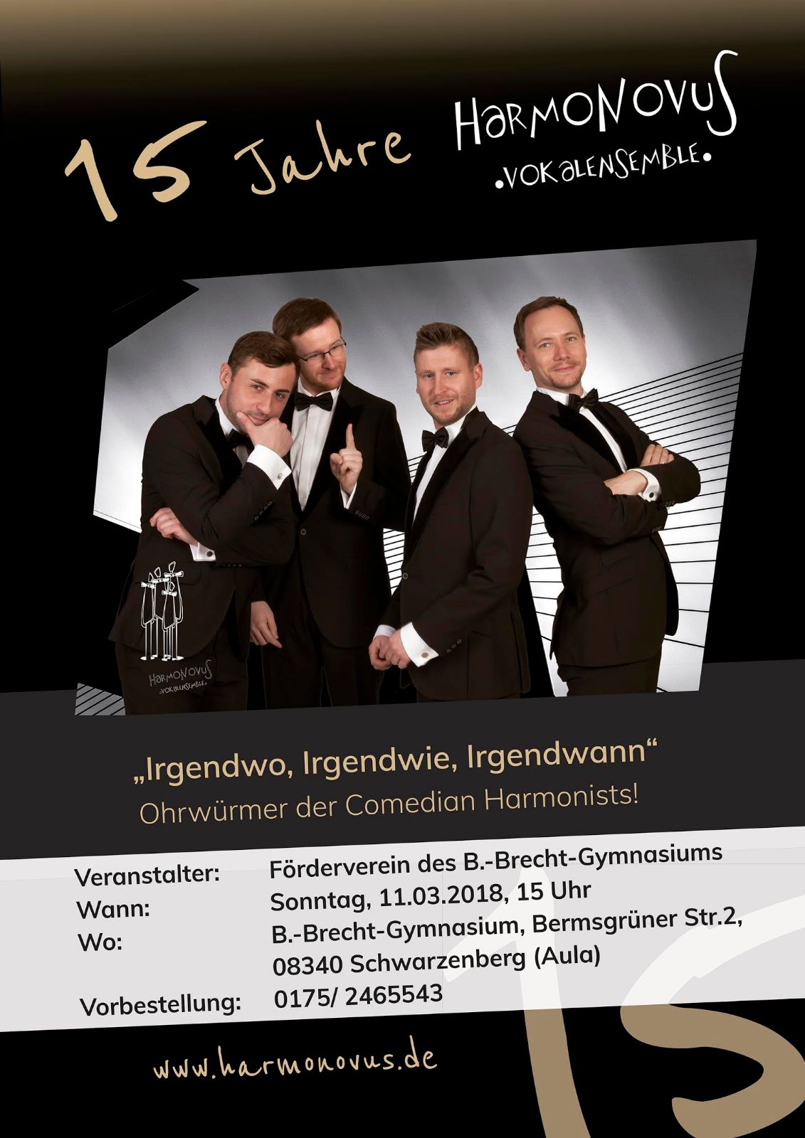 Weiterlesen →Im Jubiläumsjahr gab das Vokalensemble „Harmonovus“ ihr 10. Frauentagskonzert am 11. März 2018 in der Aula des Bertolt-Brecht-Gymnasiums Schwarzenberg. Unter dem Motto „Irgendwo, Irgendwie, Irgendwann“ sangen Sie vor allem Ohrwürmer der Comedian Harmonists. Frederik Haarig (1. Tenor und Moderation), Christian Herrmann (Bass und Klavier), die zu den Gründungsmitgliedern gehören, sowie Martin Ackermann (2. Tenor) und Gustav Augart (Bariton) begeisterten die Zuschauer zum wiederholten Mal. Die Gäste hoffen, dass die Tradition der Frauentagskonzerte auch im nächsten Jahr fortgesetzt wird.